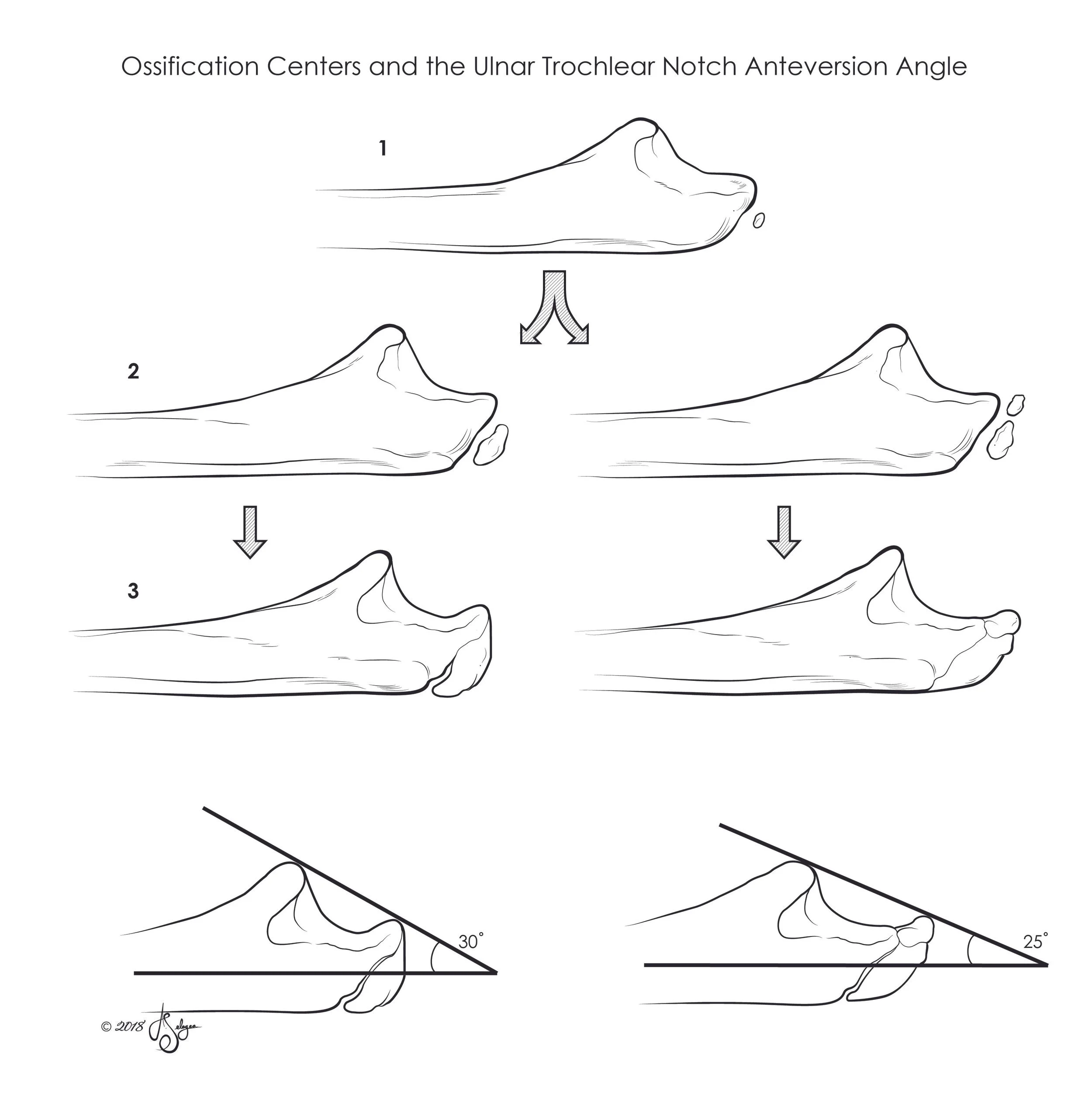 Working with an orthopaedic surgeon was an invaluable experience and allowed me to create this digital line drawing for publication in a medical journal. This piece depicts two possible developmental routes the ulna can undergo in regards to olecranon ossification; depending on the route taken and number of ossification centers present, the anteversion angle is affected, which plays a role in hyperextension of the elbow in children. This was my first piece created for a real client, and the collaboration taught me important skills not only in illustrating with simple line, but also how to cater to the client’s needs while offering my own skills and artistic expertise to produce a clear and communicative illustration.